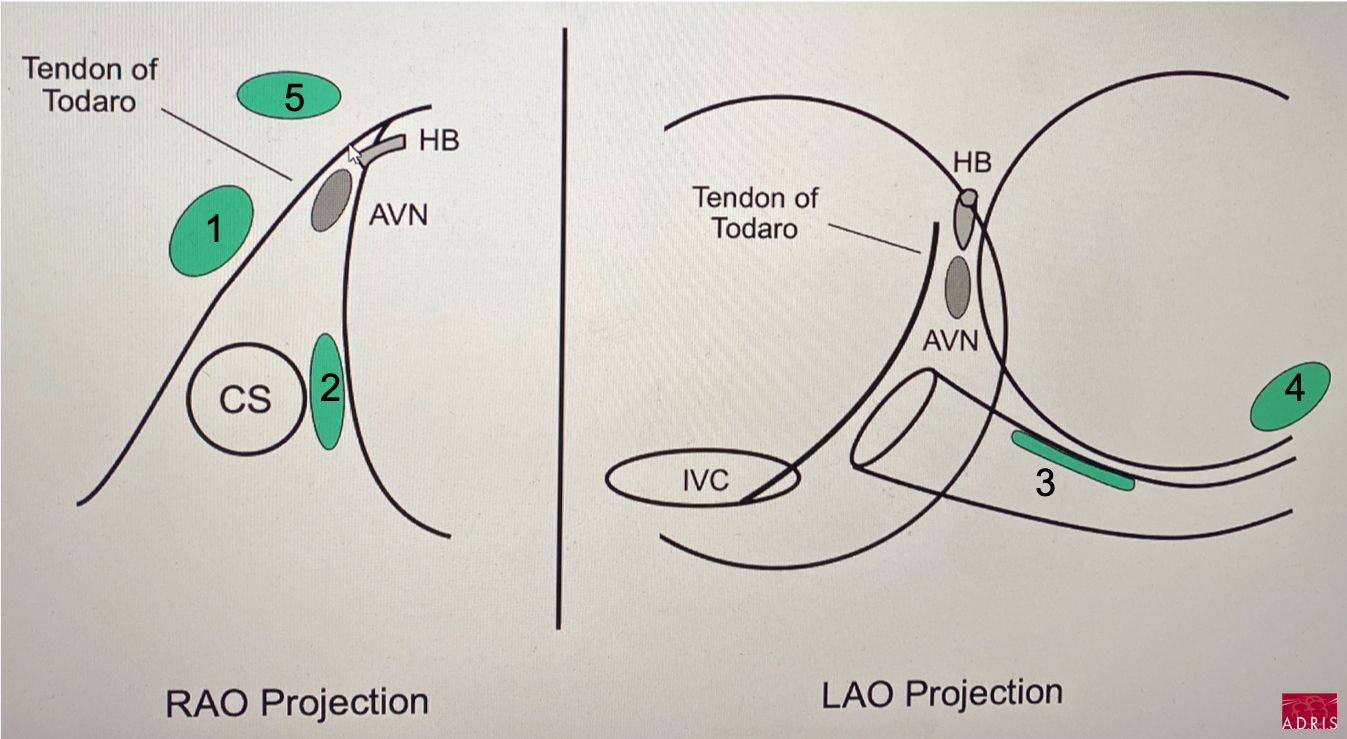 - extension inférieure droite du NAV : en avant de l’ostium du sinus coronaire à la base du triangle de Koch (2), relayer à l'OG par le plancher du sinus coronaire