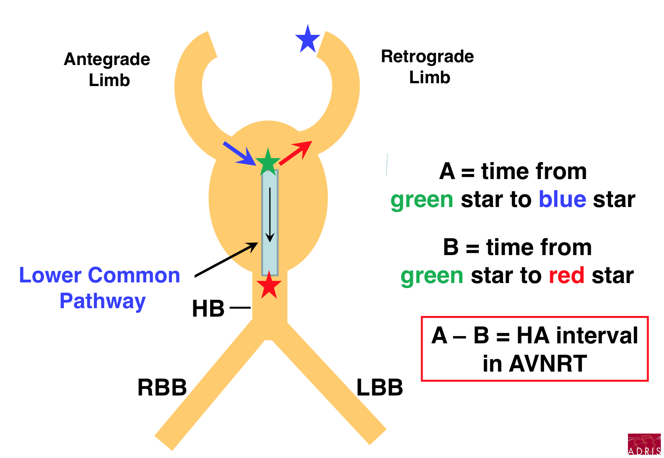 Le substrat de la tachycardie par réentrée intra-nodale est constitué de 2 voies parmi les 5 suivantes. Ces voies sont constituées de cellules transitionnelles entre les cellules atriales et les cellules du noeud compact.