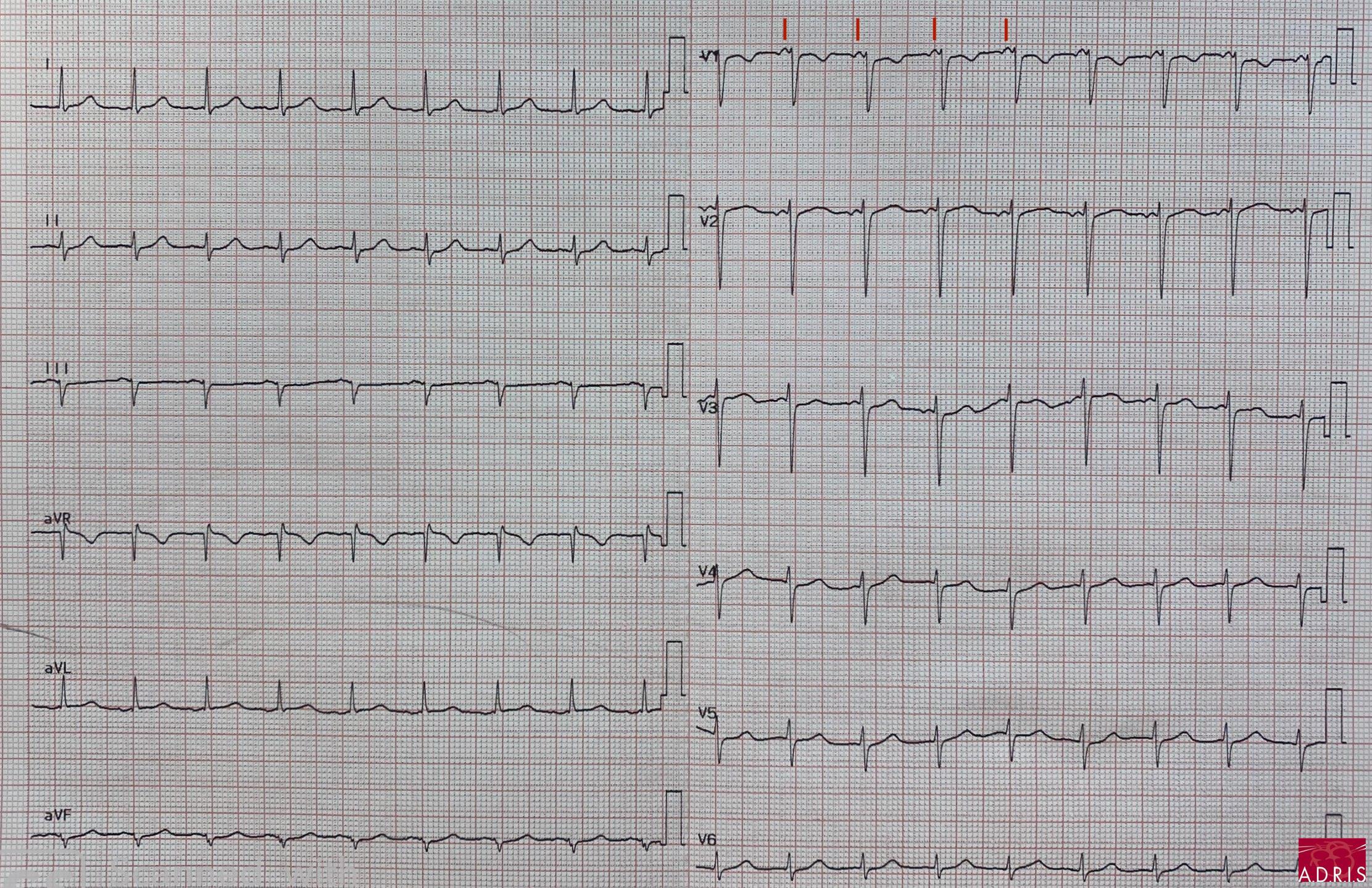 - l'onde P' peut précéder ou suivre immédiatement le QRS ou parfois être enfuie dans le QRS