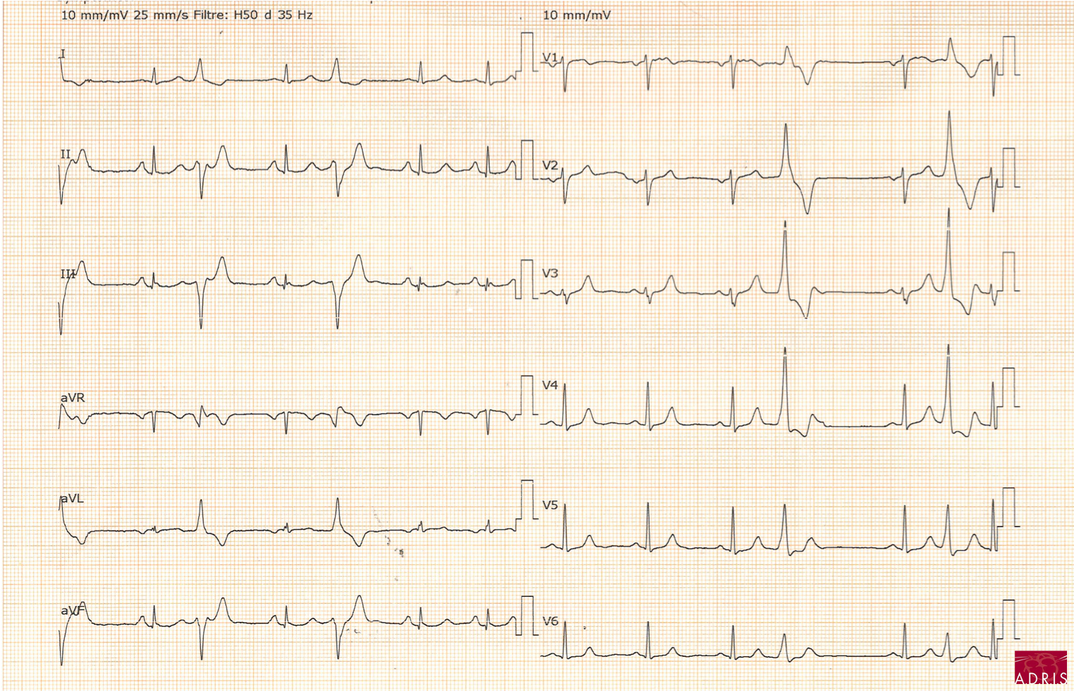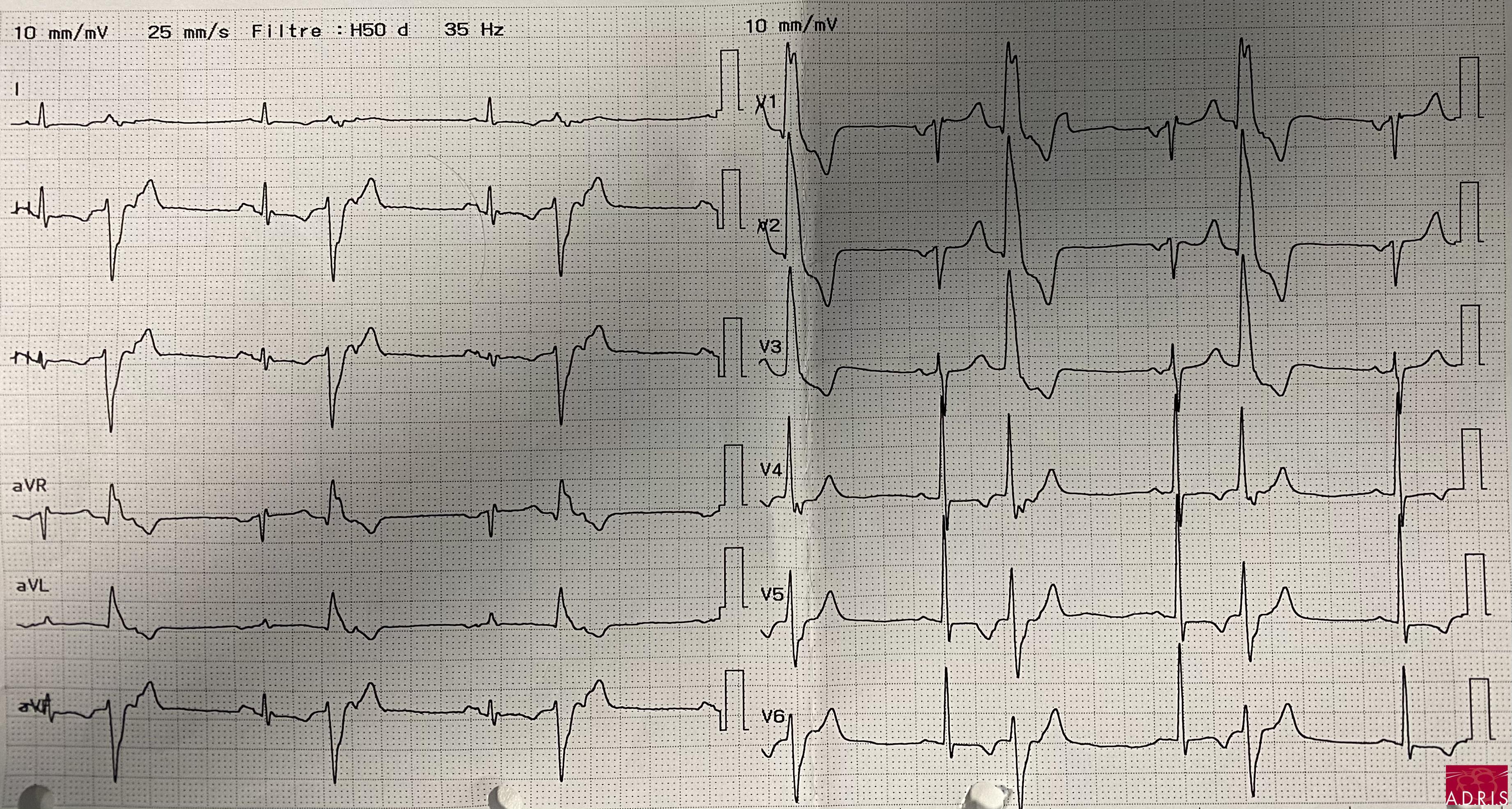 - QRS larges, prématuré par rapport à l'intervalle RR normal et non précédé d'une onde P (sauf si tombe par hasard devant une onde P mais PR raccourci)