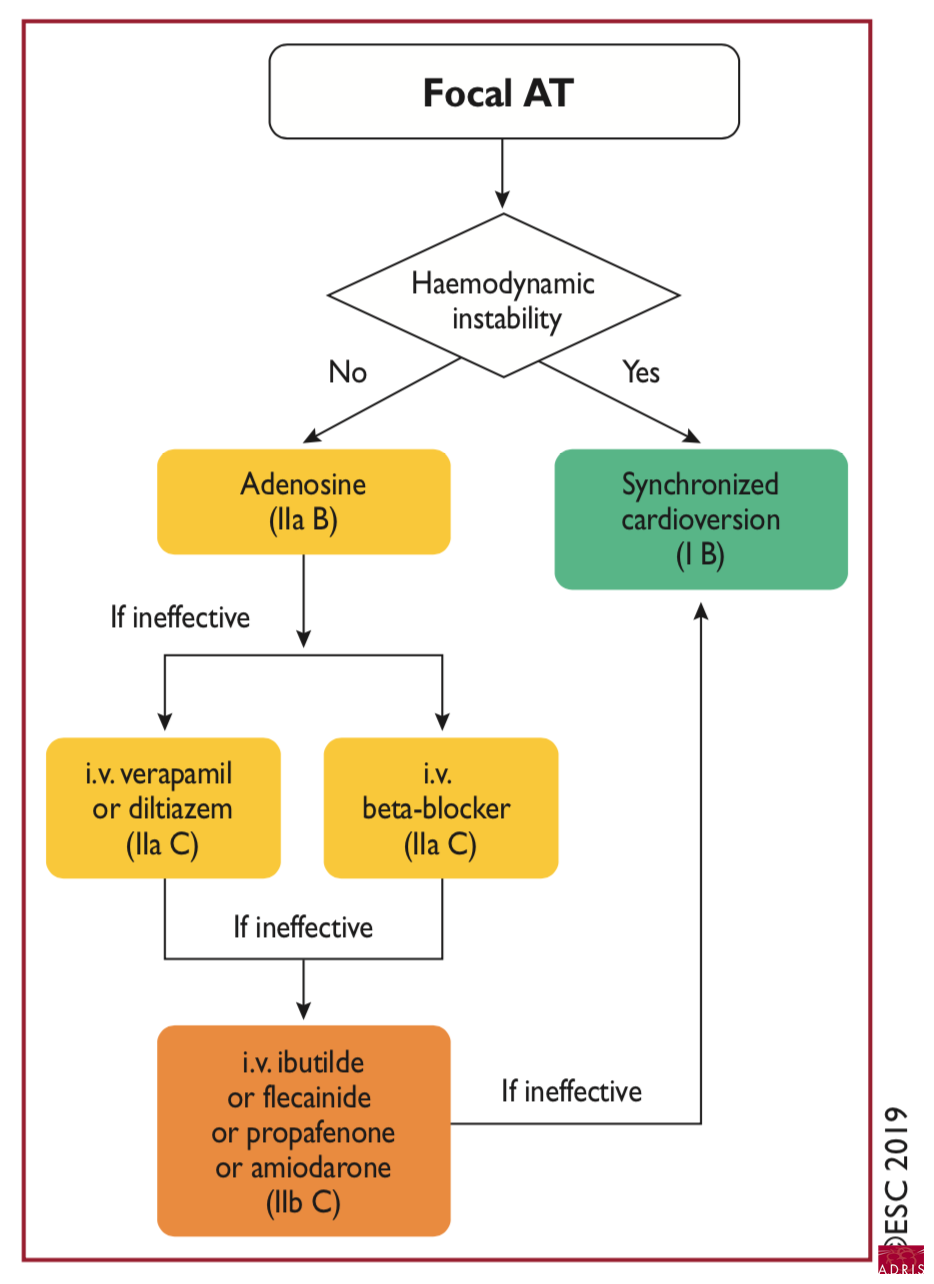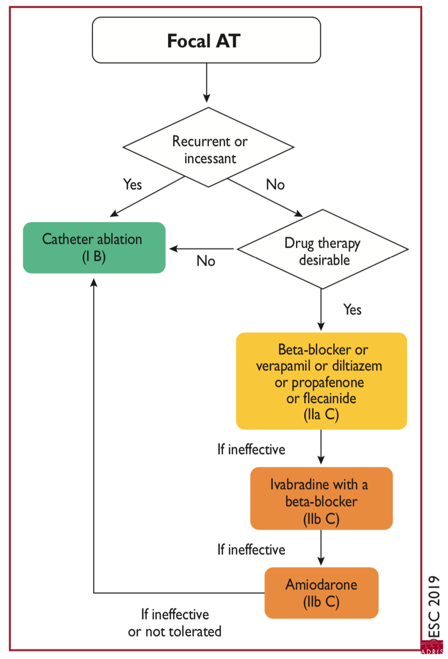 - tachycardie atriale multifocale : nourrisson (de bon pronostic) et adulte (oreillette pathologique et facteurs favorisants : infection, hypokaliémie, surcharge digitalique…)