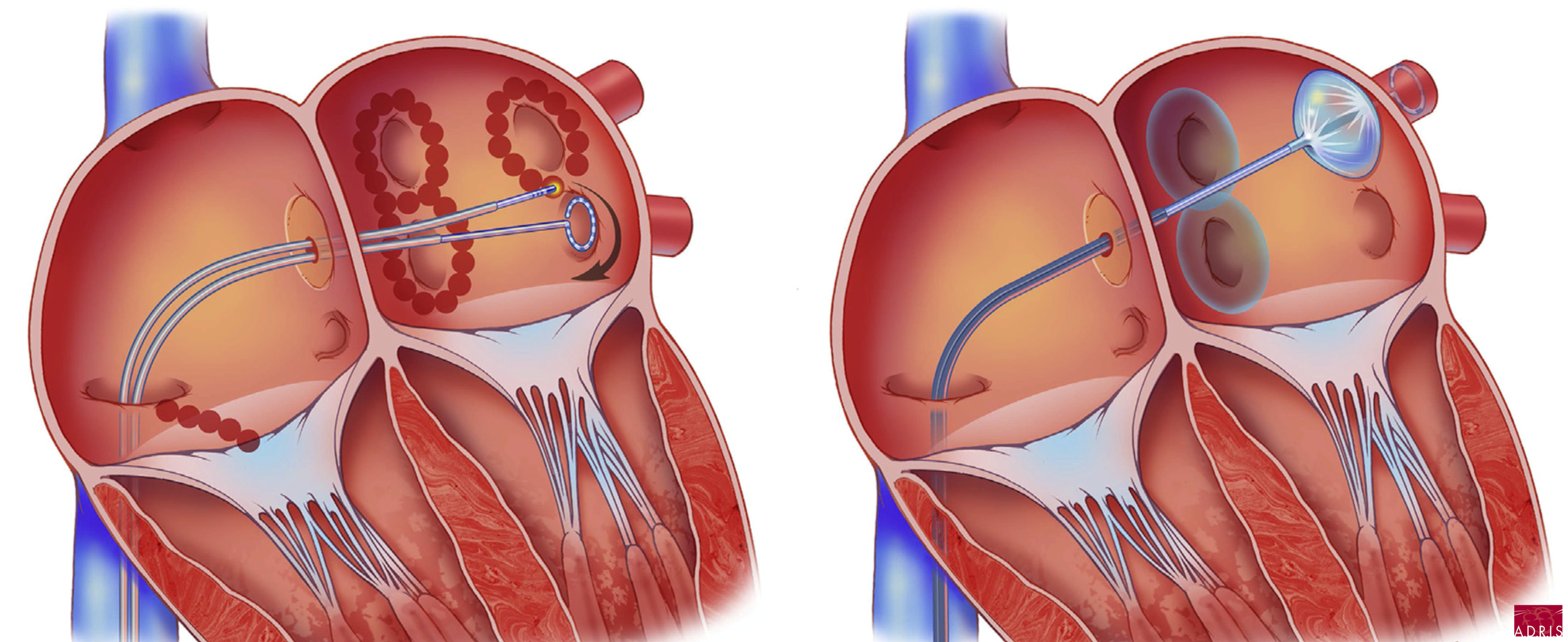 Nous disposons des 2 dernières techniques d’ablation de fibrillation atriale : la radiofréquence à gauche et la cryothérapie à droite sur le schéma.
